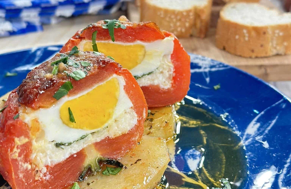 Ανοίγουμε προσεκτικά τις ντομάτες στο πάνω μέρος τους, αλλά δεν κόβουμε τελείως για να δημιουργήσουμε κατ΄ αυτόν τον τρόπο ένα καπάκι. Με ένα κουτάλι αφαιρούμε προσεκτικά το εσωτερικό της ντομάτας προσπαθώντας να μη τρυπήσουμε τα τοιχώματα της.