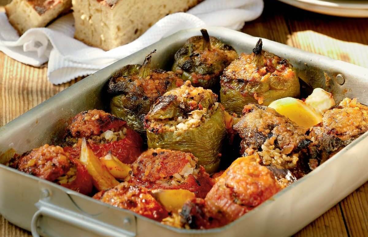 Γέμισμα: Γεμίζουμε κάθε λαχανικό μέχρι τα 3/4 γιατί θα φουσκώσει το ρύζι με το ψήσιμο. Βάζουμε τα καπάκια και τα αραδιάζουμε σε βαθύ ταψί, το ένα κοντά στο άλλο. Σε ένα μπολ χτυπάμε με σύρμα την υπόλοιπη αλεσμένη ντομάτα με το υπόλοιπο 1 φλ. ελαιόλαδο. Προσθέτουμε αλάτι και πιπέρι και μ’ ένα κουτάλι τα περιχύνουμε στο ταψι.