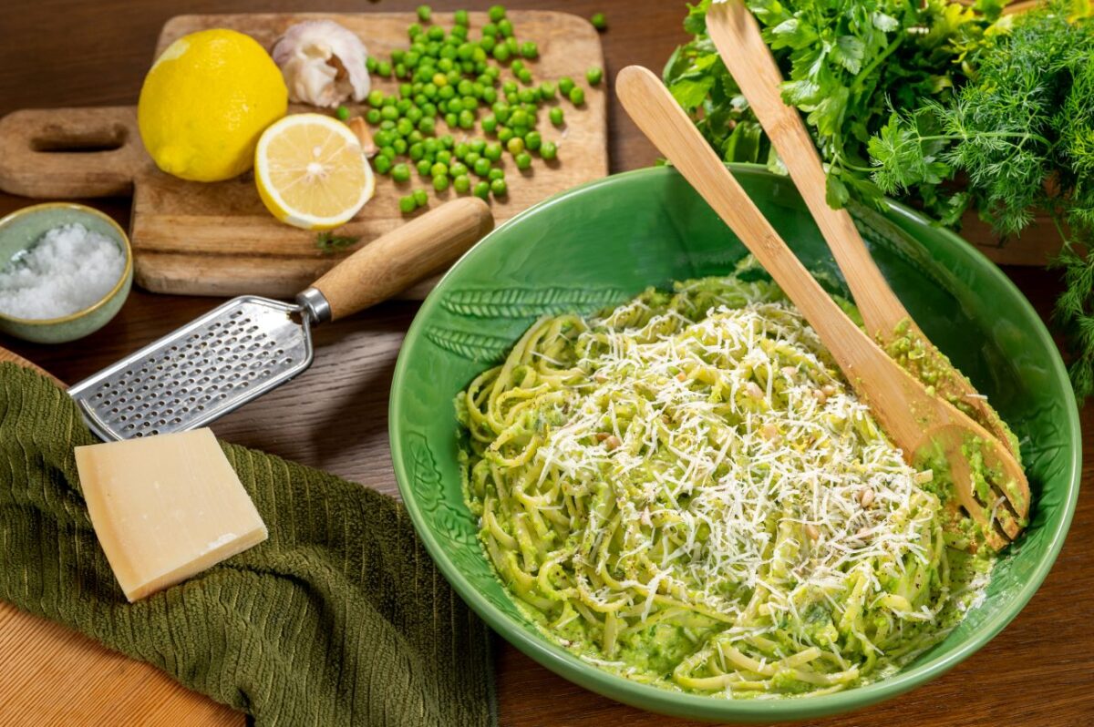 Αρχικά βράζουμε τον αρακά σε αλατισμένο νερό για 3 λεπτά. Σουρώνουμε και μεταφέρουμε σε ένα πολυμηχάνημα και πολτοποιούμε. Στη συνέχεια φτιάχνουμε το πέστο, ρίχνουμε μέσα στο πολυμηχάνημα τα σκόρδα, τον μαϊντανό, το άνηθο, τις φλούδες λεμονιού, το χυμό λεμόνι, το ελαιόλαδο, την παρμεζάνα και το κουκουνάρι και πολτοποιούμε. Αδειάζουμε το πέστο σε μία ευρύχωρη και βαθιά πιατέλα. Βράζουμε τα λιγκουίνι σε αρκετό αλατισμένο νερό για όσο χρόνο να γράφει συσκευασία. Όταν είναι έτοιμα παίρνουμε κατευθείαν από την κατσαρόλα και μεταφέρουμε πάνω στο πέστο. Περιχύνουμε και με δύο μεγάλες κουτάλες από το νερό που έβρασα τα λιγκουίνι και ανακατεύουμε πολύ καλά μέχρι να δέσει η σάλτσα. Σερβίρουμε με τριμμένη παρμεζάνα, λίγο ξύσμα λεμονιού και φρεσκοτριμμένο πιπέρι.