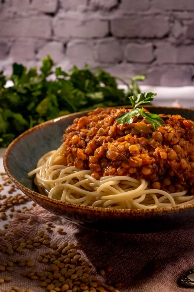 Αρχικά βράζουμε τις φακές με αρκετό νερό μέχρι να μαλακώσουν, σουρώνουμε και κρατάμε στην άκρη. Ξεφλουδίζουμε εξωτερικά τα μανιτάρια και θρυμματίζουμε σε ένα μπλέντερ. Σε μία βαθιά κατσαρόλα ζεσταίνουμε το ελαιόλαδο και σοτάρουμε το κρεμμύδι και το σκόρδο ψιλοκομμένα μέχρι να πάρουν χρώμα. Ρίχνουμε τις φακές, τα μανιτάρια και το καρότο και ανακατεύουμε για 1 λεπτό. Προσθέτουμε τα μπαχαρικά, το θυμάρι, τα φύλλα δάφνης, το ξύλο κανέλας, το γαρίφαλο και τον πελτέ. Ανακατεύουμε μέχρι να διαλυθεί ο πελτές και να βγάλει τα αρώματα του. Σβήνουμε με το κρασί και αφήνουμε να εξατμιστεί. Βάζουμε την τριμμένη ντομάτα, αλατοπιπερώνουμε και προσθέτουμε μία κούπα ζεστό νερό. Μαγειρεύουμε σε χαμηλή θερμοκρασία με σκεπασμένη την κατσαρόλα για περίπου 20 λεπτά. Εντωμεταξύ βράζουμε τα ζυμαρικά σε μία μεγάλη κατσαρόλα με αρκετό αλατισμένο νερό για όσο χρόνο αναγράφει η συσκευασία. Σουρώνουμε τα ζυμαρικά και ραντίζουμε με λίγο ελαιόλαδο. Τέλος, σερβίρουμε τα σπαγγέτι με μπόλικη σάλτσα κιμά από φακές.