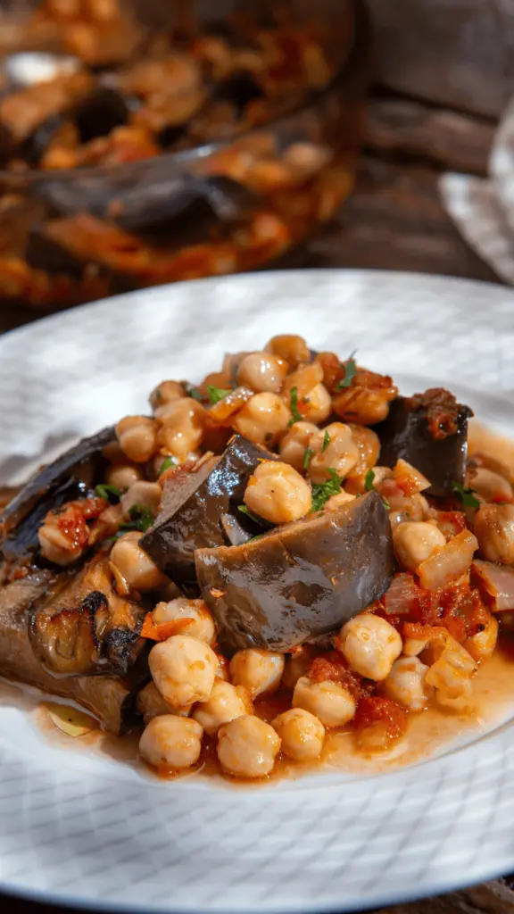 Από το προηγούμενο βράδυ βάζουμε τα ρεβίθια σε αρκετό νερό ώστε να μουλιάσουν. Την επόμενη μέρα ξεπλένουμε τα ρεβίθια και μεταφέρουμε σε μία κατσαρόλα με αρκετό νερό. Βράζουμε σε μέτρια θερμοκρασία για περίπου 40 λεπτά μέχρι να μαλακώσουν. Εντωμεταξύ κόβουμε τις μελιτζάνες σε μέτρια κομμάτια και τις τηγανίζουμε ελαφριά σε καυτό ελαιόλαδο μέχρι να πάρουν χρώμα. Αδειάζουμε σε πιατέλα με απορροφητικό χαρτί και κρατάμε στην άκρη. Σε ένα βαθύ τηγάνι ζεσταίνουμε το ελαιόλαδο και σοτάρουμε το κρεμμύδι ψιλοκομμένο, το πράσο σε φέτες και το σκόρδο μέχρι να πάρουν χρώμα. Στη συνέχεια, ρίχνουμε τα ρεβίθια και ανακατεύουμε για 1 λεπτό. Σβήνουμε με το κρασί και αφήνουμε να εξατμιστεί. Βάζουμε την ντομάτα, την ζάχαρη, τα φύλλα δάφνης και αλατοπιπερώνουμε. Ψήνουμε σε μέτρια θερμοκρασία για περίπου 10 λεπτά. Μεταφέρουμε τις μελιτζάνες σε ένα ταψί και ρίχνουμε τα ρεβίθια με τη σάλτσα. Διαλύουμε τον κύβο στο ζεστό νερό και περιχύνουμε το φαγητό. Πασπαλίζουμε όλη την επιφάνεια με ψιλοκομμένο μαϊντανό. Ψήνουμε σε προθερμασμένο φούρνο στους 180 βαθμούς για περίπου 30 λεπτά. Τα τελευταία 15 λεπτά ξεσκεπάζουμε το φαγητό και αφήνουμε να πάρει χρώμα.