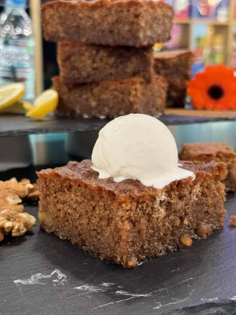 Μεταφέρουμε σε βουτυρωμένο και αλευρωμένο ταψί 28 εκ. και ψήνουμε στον αέρα, στους 170 βαθμούς, για 40 λεπτά. Βγάζουμε από τον φούρνο και σιροπιάζουμε με κρύο σιρόπι και ζέστη καρυδόπιτα. Όταν κρυώσει συντηρείται στο ψυγείο.