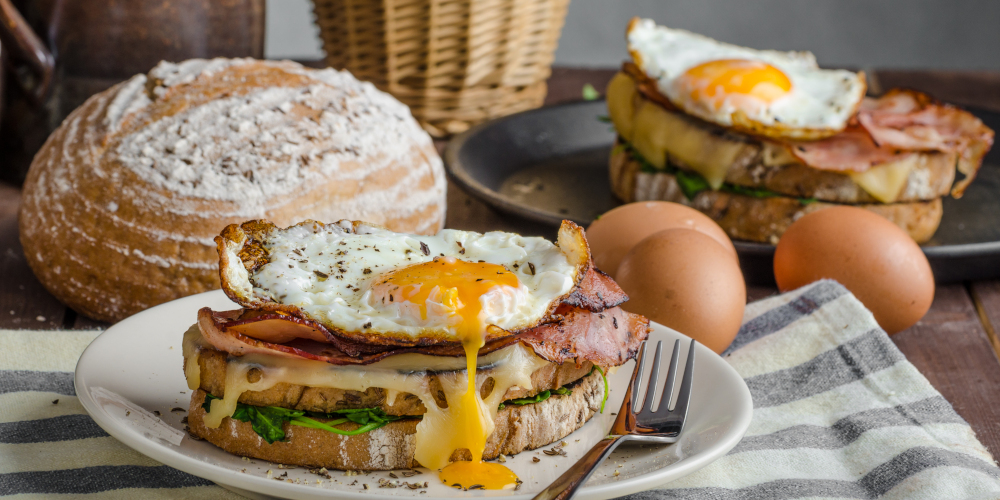 Για το ένα σάντουιτς: Αλείφουμε τις φέτες ψωμιού με βούτυρο και φρυγανίζουμε καλά. Αλείφουμε με μουστάρδα τις φέτες ψωμιού. Στη μία φέτα ψωμιού αλείφουμε λίγη μπεσαμέλ, βάζουμε 1 1/2 φέτα ζαμπόν και σκεπάζουμε με την άλλη φέτα. Ξαναβάζουμε 1 1/2 φέτα ζαμπόν και σκεπάζουμε πάλι με μία στρώση μπεσαμέλ, πασπαλίζουμε με γραβιέρα τριμμένη και ψήνουμε στο γκριλ του φούρνου για να πάρει χρώμα. Φτιάχνουμε και το δεύτερο σάντουιτς και κάνουμε το ίδιο. Σερβίρουμε με τηγανητό αυγό από πάνω.