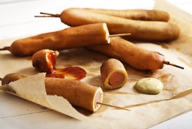 Βάζουμε πρώτα σε μπολ το καλαμποκάλευρο, το αλεύρι και τη ζάχαρη. Προσθέτουμε το baking powder, αλάτι και πιπέρι και ανακατεύουμε για να φτιάξουμε τα κορν ντογκ.