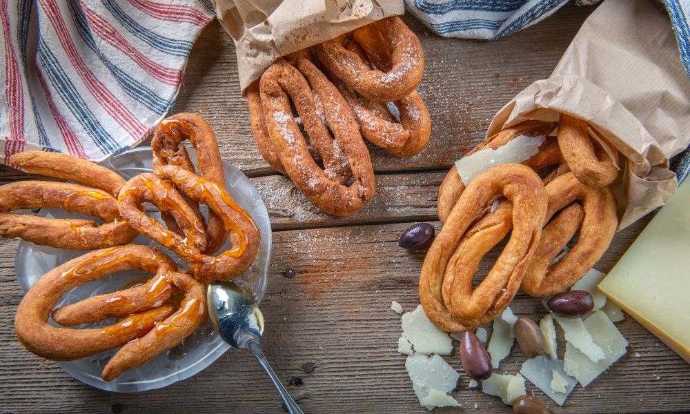 Ρίχνουμε σταδιακά μέσα στο μείγμα και ζυμώνουμε πολύ καλά μέχρι να έχουμε μία μαλακή και εύπλαστη ζύμη. Καλύπτουμε με μεμβράνη και αφήνουμε για περίπου 2 ώρες να φουσκώσει. Αφού έχει περάσει ο χρόνος, αδειάζουμε την ζύμη στον πάγκο εργασίας. Χωρίζουμε σε μπάλες όσο ένα καρύδι. Πλάθουμε σε κορδόνια και τυλίγουμε σε σχήμα σπείρας ή σε διαφορά σχήματα.