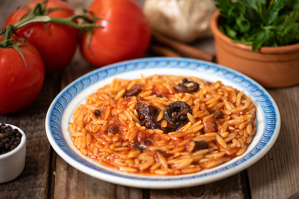 Στη συνέχεια το αποσύρουμε από το σκεύος. Κόβουμε τα πλοκάμια και την κουκούλα σε ισομεγέθη κομμάτια. Σε κατσαρόλα ζεσταίνουμε ελαιόλαδο. Σοτάρουμε το κρεμμύδι και σκόρδο για λίγα λεπτά. Όταν ροδίσουν, προσθέτουμε το χταπόδι και το ανακατεύουμε για 1-2 λεπτά. Ρίχνουμε την ντομάτα κονκασέ και τον πελτέ ντομάτας. Προσθέτουμε νερό στην κατσαρόλα και αφήνουμε να πάρει βράση. Αφού βράσει, ρίχνουμε το κριθαράκι. Αλατοπιπερώνουμε. Αφήνουμε το κριθαράκι να βράσει μέχρι να μαλακώσει και να χυλώσει η σάλτσα. Πρέπει το γιουβέτσι να έχει απορροφήσει όλα τα υγρά και να έχει μείνει μόνο με τη σάλτσα του.