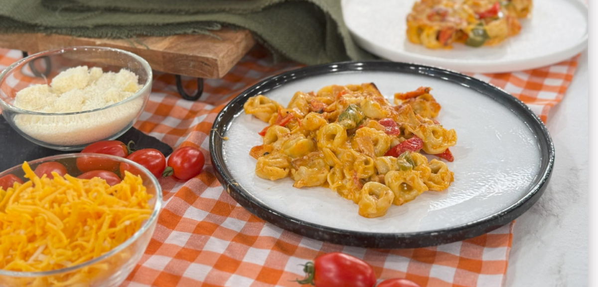 Βράζουμε τα τορτελίνια για 4 λεπτά,σουρώνουμε και προσθέτουμε λίγο ελαιόλαδο. Προθερμαίνουμε τον φούρνο, στους 200 βαθμούς, στον αέρα. Σοτάρουμε σε ένα τηγάνι το ψιλοκομμένο μπέικον, το ψιλοκομμένο κρεμμύδι και τις πιπεριές.