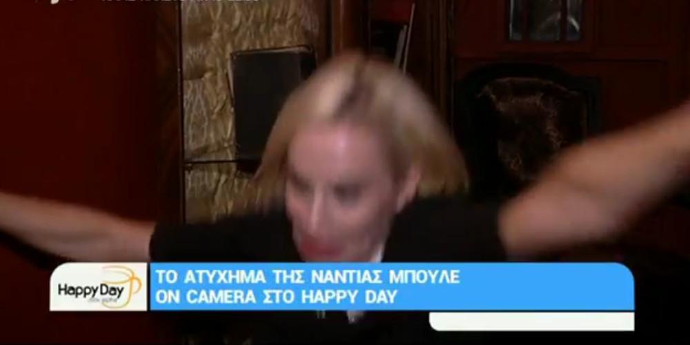 Η Νάντια Μπουλέ το πρωί της Τρίτης φιλοξενήθηκε στην εκπομπή και αφού μίλησε ωραία και καλά για όλα, για επαγγελματικά σχέδια, γάμους και παιδιά την ώρα που αποχαιρετούσε τον δημοσιογράφο της εκπομπής, και πήγε να σηκωθεί από την καρέκλα της… έπεσε!