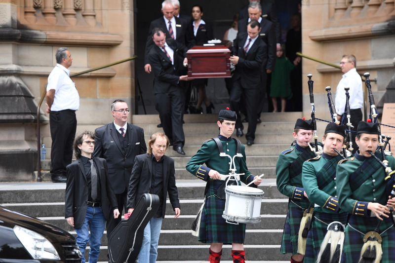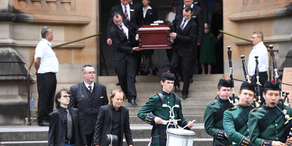 Ο πρώην ντράμερ των AC/DC Μάικλ Τσαγκ και ο Αυστραλός ρόκερ Τζίμι Μπαρνς παρακολούθησαν την τελετή στον Καθεδρικό Ναό Σεντ Μέρις, ενώ σύμφωνα με το αυστραλιανό πρακτορείο ειδήσεων Associated Press (AAP), ο μικρότερος αδελφός του Άνγκους τοποθέτησε πάνω στο φέρετρο μια κιθάρα.