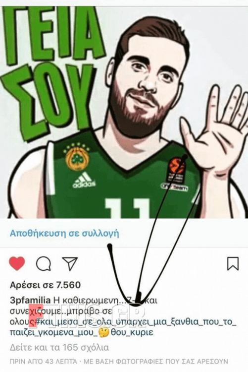 Συγκεκριμένα, χθες βράδυ, μετά το τέλος του αγώνα Παναθηναϊκός – Μάλαγα, πόσταρε στο Instagram, ένα σκίτσο του, σχολιάζοντας στη λεζάντα που το συνόδευε: “Η καθιερωμενη…7-3 και συνεχιζουμε..μπραβο σε όλους…», με σκοπό να συγχαρεί την ομάδα του.