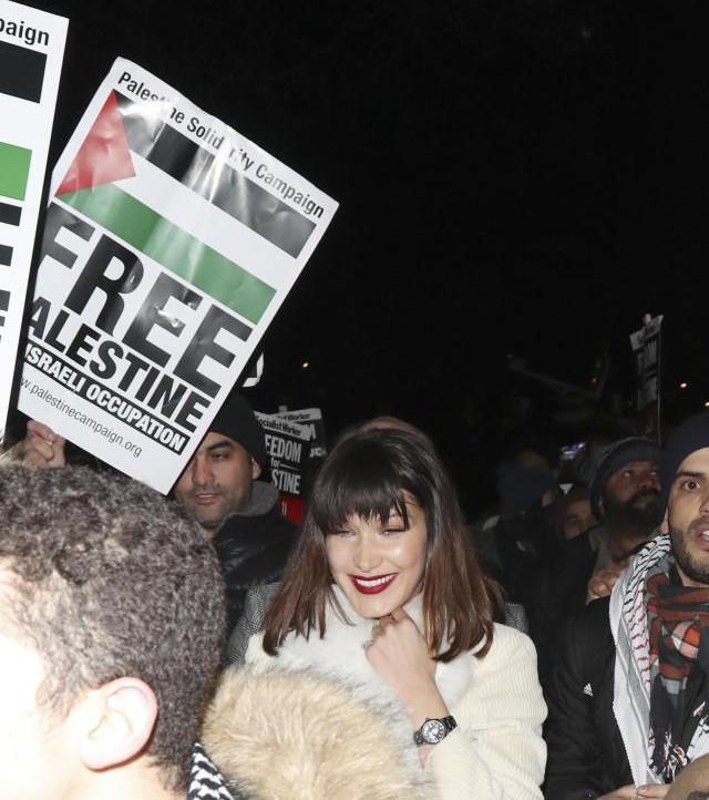 Το μοντέλο, το οποίο είναι παλαιστινιακής καταγωγής, έβγαλε το κεφάλι του από το αυτοκίνητο για να τραβήξει φωτογραφίες και έπειτα – φορούσε ένα κόκκινο φόρεμα και ένα λευκό παλτό για το πάρτι – βγήκε έξω για να μπει ανάμεσα στους διαδηλωτές.