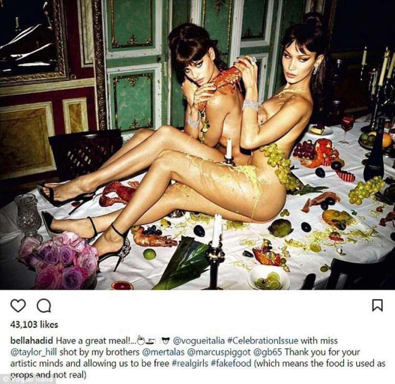 Σε μια αποκαλυπτική λήψη που δημοσιεύτηκε στο Instagram, η Hadid εμφανίζεται γυμνή με το μοντέλο Taylor Hill καλυμμένες με spaghetti για το νέο τεύχος Vogue Italia Celebration.
