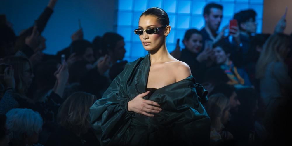 Η Bella Hadid έκλεισε το show του οίκου φορώντας ένα πολύ σέξι κοντό σορτς και μπούστο κάτω από ένα ογκώδες πανωφόρι από ταφτά.