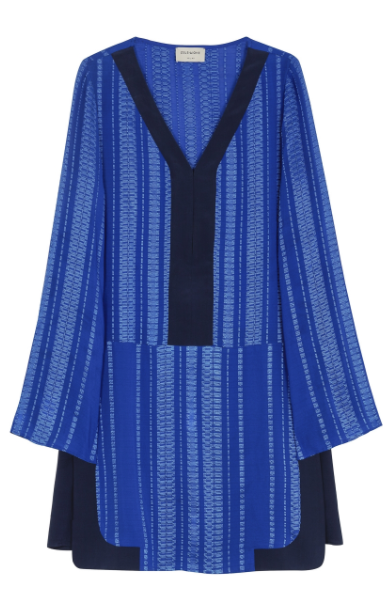 Πρόκειται για μεταξωτό φόρεμα, σε μπλε ρουά και ακολουθεί πιστά τη σχεδιαστική γραμμή του brand το οποίο δημιουργεί πολυτελή ρούχα και αξεσουάρ κατασκευασμένα από άριστες πρώτες ύλες και αξιοποιώντας Έλληνες και Ελληνίδες τεχνίτες, από τα Πομακοχώρια ως το Σουφλί. Οι μπλε κλασικές γόβες ήταν Mark Milan.