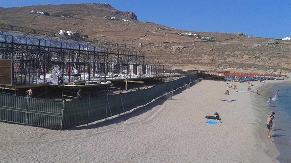 Κατασκευές –μεγαθήρια που περιλαμβάνουν εξέδρες συναυλιών, σκηνικά αλλά και μεταλλική περίφραξη ύψους μεγαλύτερου των δυο μέτρων μέσα στην άμμο στήνονται τα τελευταία δυο 24ωρα στο νησί των Ανέμων με αφορμή τον πολυσυζητημένο γάμο του Αιγύπτιου κροίσου Καριμ Αλ Σιάτι και της συντρόφου του Άνα-Μπεατρίς Μπάρος, σύμφωνα με το protothema.gr.
