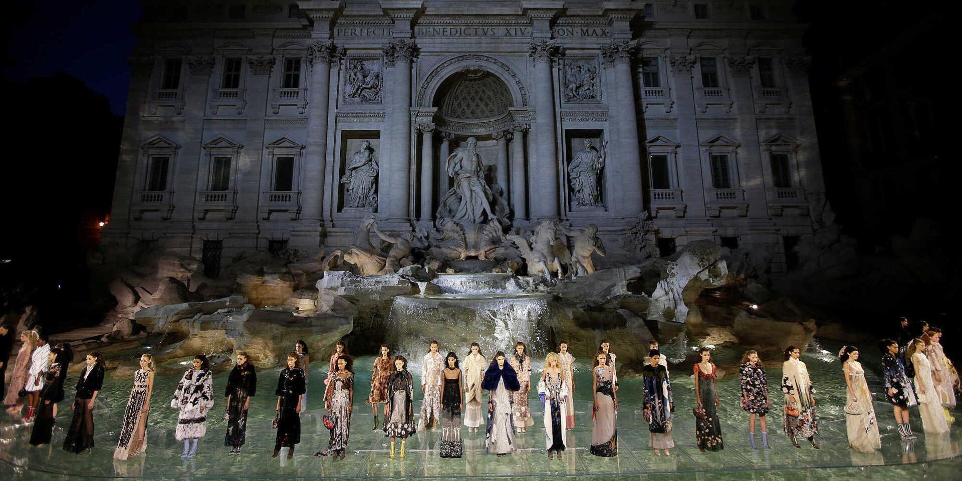 Επειτα από 17 μήνες και 2,4 εκατομμύρια δολάρια, η Φοντάνα ντι Τρέβι – το διάσημο συντριβάνι της Ρώμης, ανακαινίστηκε με δαπάνες του οίκου μόδας για να γίνει το μεγαλοπρεπές σόου.