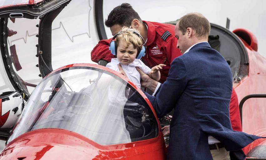 Ο Δούκας του Κέμπριτζ βοήθησε τον γιο του να καθίσει στην θέση του κυβερνήτη ενός “Hawk”, του εμβληματικού αεριωθουμένου των «Κόκκινων Βελών», του ακροβατικού αεροπορικού σμήνους της Βασιλικής Βρετανικής Αεροπορίας (RAF), σε μια έκθεση της πολεμικής αεροπορίας στο Φέρφορντ στη νοτιοδυτική Βρετανία.
