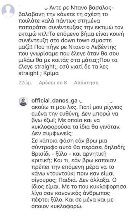«Άντε ρε Ντανο Βασαλος-Βαλαβανη την κάνετε τη σχέση το πουλάτε καλά πάντως στημένα παπαράτσι συνεντεύξεις την εκτιμώ τον εκτιμώ κτλ! Το επόμενο βήμα είναι κοινή συνέντευξη στο down town είμαστε μαζί!! Που πήγε ρε Ντανο ο Λεβέντης που γνωρίσαμε που έλεγε όταν θα σου μιλάω θα με κοιτάς στα μάτια;; Που τα έλεγε straight;; Εσύ γιατί δε τα λες straight ; Κρίμα.», του έγραψε κάτω από φωτογραφία του στο Instagram.