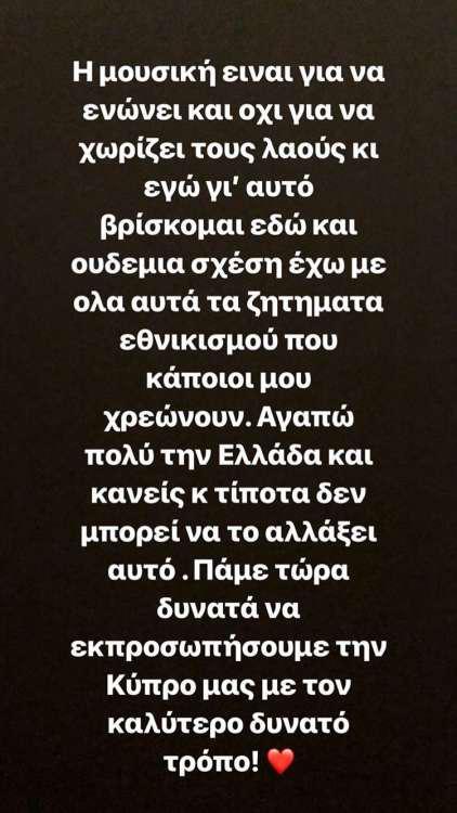 «Η μουσική είναι για να ενώνει και όχι για να χωρίζει τους λαούς και γι’αυτό βρίσκομαι εδώ και ουδεμία σχέση με όλα αυτά τα ζητήματα εθνικισμού που κάποιοι μου χρεώνουν. Αγαπώ πολύ την Ελλάδα και κανείς και τίποτα δεν μπορεί να το αλλάξει αυτό. Πάμε τώρα δυνατά να εκπροσωπήσουμε την Κύπρο μας με τον καλύτερο δυνατό τρόπο», έγραψε στο μήνυμά της η τραγουδίστρια.