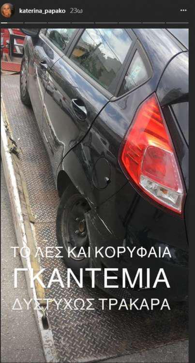 «Επειδή με ρωτάτε αν είμαι καλά, είχα ένα ατύχημα το πρωί στο Μοσχάτο. Ευτυχώς θλάση αυχένα! Τίποτα πιο σοβαρό ελπίζω!», ανέφερε σε ανάρτησή της λίγο αργότερα η Κατερίνα Παπακωστοπούλου.