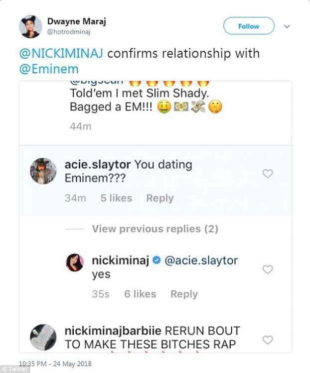 Εδώ και μερικούς μήνες η Μινάζ είχε χωρίσει από τον πρώην σύντροφο της και οι φήμες ότι βγαίνει με τον Έμινεμ είχαν φουντώσει. Η ίδια το επιβεβαίωσε απαντώντας σε έναν ακόλουθο της στο Twitter.