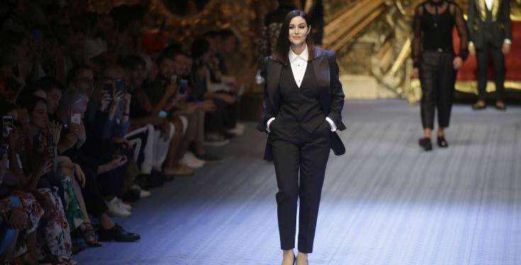 Actress Monica Bellucci wears a creation as part of Dolce & Gabbana’s 2019 Spring-Summer collection, unveiled during the Fashion Week in Milan, Italy, Saturday, June 16, 2018. (AP Photo/Luca Bruno)