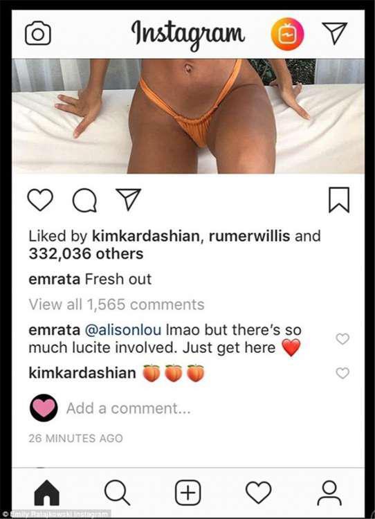Όπως ήταν αναμενόμενο τα likes και τα κολακευτικά σχόλια που απέσπασε είναι χιλιάδες. Ακόμα και η Kim Kardashian μπήκε στον πειρασμό και σχολίασε τη φωτογραφία της Emily. Όπως θα δείτε παρακάτω η Kim σχολίασε με το γνωστό emoticon «ροδάκινο» που στη… γλώσσα των social media παραπέμπει στα όμορφα οπίσθια.