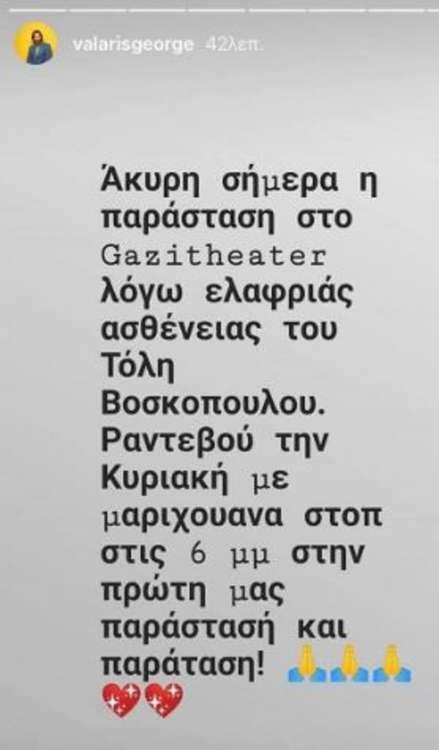 Τι συμβαίνει; O Τόλης Βοσκόπουλος είναι αδιάθετος, έχει πάθει μία ελαφρά βρογχίτιδα, γι’ αυτό και ακυρώθηκε η σημερινή παράσταση στη σκηνή του GAZI THEATRE, αλλά κανονικά θα γίνει η παράσταση της Κυριακής 6 Ιανουαρίου στις 6 μ.μ.