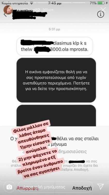 Σύμφωνα με την Ξανθή Τζερεφού, η οποία κάνει πλέον διεθνή καριέρα, άγνωστος στο Instagram της έστειλε μήνυμα προκειμένου να συνευρεθούν ερωτικά, με αντάλλαγμα το ποσό ων 3.000 ευρώ.
