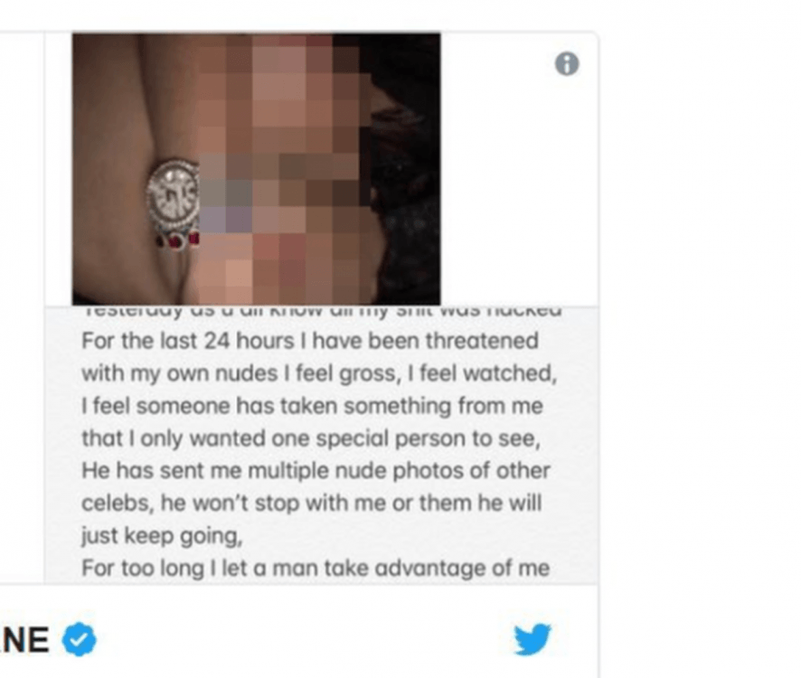 Την προηγούμενη εβδομάδα άγνωστοι χάκαραν τον λογαριασμό της στο Twitter και στη συνέχεια την απειλούσαν ότι θα έδιναν στη δημοσιότητα γυμνές φωτογραφίες της και βίντεο.
