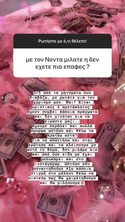 «3/5 από τα μηνύματα που διαβάζω, με ρωτάτε για τον χωρισμό μου. Ναι! Eίναι οριστικός και αμετάκλητος. Έχουν συμβεί κάποια πράγματα και δεν γινόταν να είμαστε μαζί… Έχουμε περάσει και πολλά όμορφα ωστόσο και θέλω να κρατάω αυτά! Για να απαντήσω και στην ερώτηση και να κλείσουμε με αυτό το θέμα, δεν μιλάμε πια και από όσο είδα με έχει μπλοκάρει και στο Instagram. Ωστόσο εάν συναντηθούμε έξω, κάποια στιγμή στο μέλλον, θέλω να πιστεύω πως θα χαιρετηθούμε και θα μιλήσουμε».