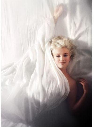 Η Μέριλιν δεν αισθανόταν άνετα όταν ξεκίνησε η φωτογράφιση με την ίδια να φορά μια τουαλέτα. Κι έτσι έκανε αυτό που ήξερε να κάνει η Μέριλιν Μονρόε: πήγε στο καμαρίνι, γδύθηκε, γλίστρησε αιφνιδιαστικά στο ξέστρωτο κρεβάτι και τυλίχτηκε με το λευκό μεταξωτό σεντόνι.