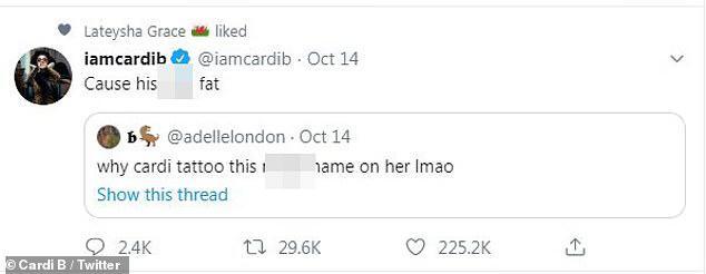 Κι αφού στο Instagram είχε εξαντλήσει όλα τα σενάρια, πήρε μπρος και στο Twitter απαντώντας σε ένα χρήστη για το τατουάζ που έχει στα μπούτια της και είναι το όνομα του άντρα της. Εδώ η Cardi B επαίνεσε το μόριο του.