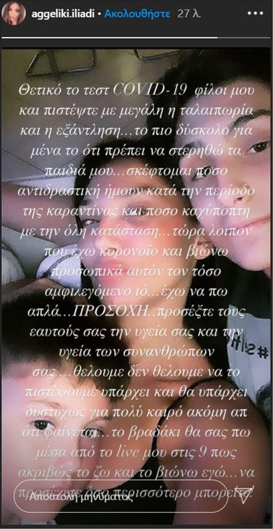 «Θετικό το τεστ Covid-19 φίλοι μου και πιστέψτε με μεγάλη η ταλαιπωρία και η εξάντληση… το πιο δύσκολο για μένα είναι ότι πρέπει να στερηθώ τα παιδιά μου.