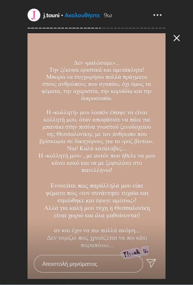 Οπως έγραψε η Θεσσαλονικιά influencer, η Βρισηίδα Ανδριώτου επέλεξε να συναντηθεί με τον άνθρωπο που βρίσκεται πίσω από τη δημοσιοποίηση ροζ βίντεό της. «Δε μαλώσαμε… Την ξέκοψα οριστικά και αμετάκλητα! Μπορώ να συγχωρήσω πολλά πράγματα στους ανθρώπους που αγαπάω, όχι μόνο τα ψέματα, την αχαριστία, κοροϊδία και τη διπροσωπία. Η “κολλητή” μου λοιπόν έπαψε να είναι κολλητή μου, όταν αποφάσισε να πάει για μπανάκι στην πισίνα γνωστού ξενοδοχείου της Θεσσαλονίκης με τον άνθρωπο που βρίσκομαι σε δικηγόρους για το “ροζ βίντεο”. Ναι! Καλά κατάλαβες… Η “κολλητή μου”, με αυτόν που ήθελε να μου κάνει κακό και να με ξεφτιλίσει στο πανελλήνιο!», έγραψε η Ιωάννα Τούνη.