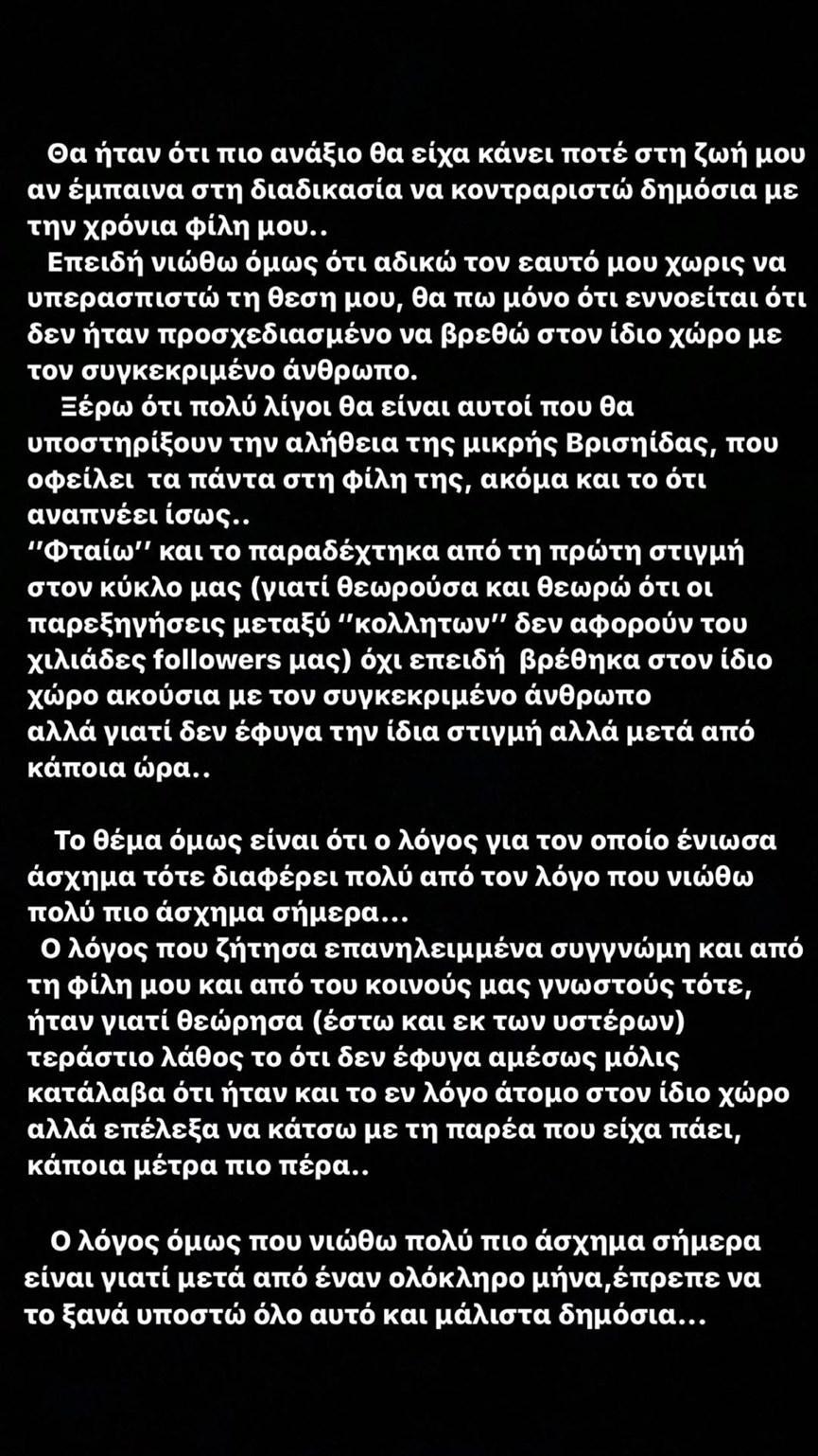 Ο λόγος που ζήτησα επανειλημμένα συγγνώμη και από την φίλη μου και από τους κοινούς μας γνωστούς τότε, ήταν γιατί θεώρησα (έστω και εκ των υστέρων) τεράστιο λάθος το ότι δεν έφυγα αμέσως μόλις κατάλαβα ότι ήταν το εν λόγο άτομο στον ίδιο χώρο αλλά επέλεξα να κάτσω με την παρέα που είχα πάει κάποια μέτρα πιο πέρα. Ο λόγος όμως που νιώθω πολύ πιο άσχημα σήμερα είναι γιατί μετά από έναν ολόκληρο μήνα, έπρεπε να το ξανά υποστώ όλο αυτό και μάλιστα δημόσια. Ευχαριστώ πολύ για τα εκατοντάδες υποστηρικτικά μηνύματά σας. Τα υπόλοιπα ήταν απλά αναμενόμενα», έγραψε η Βρισηίδα.