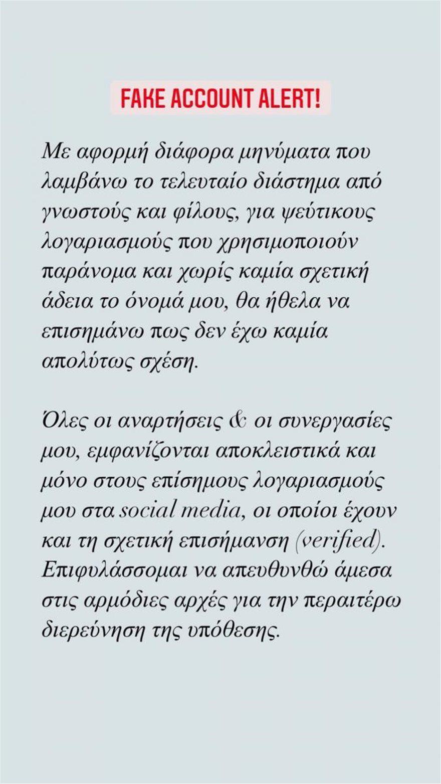 Όπως ενημέρωσε ο Σάκης Ρουβάς: «Με αφορμή διάφορα μηνύματα που λαμβάνω το τελευταίο διάστημα από γνωστούς και φίλους, για ψεύτικους λογαριασμούς που χρησιμοποιούν παράνομα και χωρίς καμία σχετική άδεια το όνομά μου, θα ήθελα να επισημάνω πως δεν έχω καμία απολύτως σχέση. Όλες οι αναρτήσεις και οι συνεργασίες μου, εμφανίζονται αποκλειστικά και μόνο στους επίσημους λογαριασμούς μου στα social media… Επιφυλάσσομαι να απευθυνθώ άμεσα στις αρμόδιες αρχές για την περεταίρω διερεύνηση της υπόθεσης».