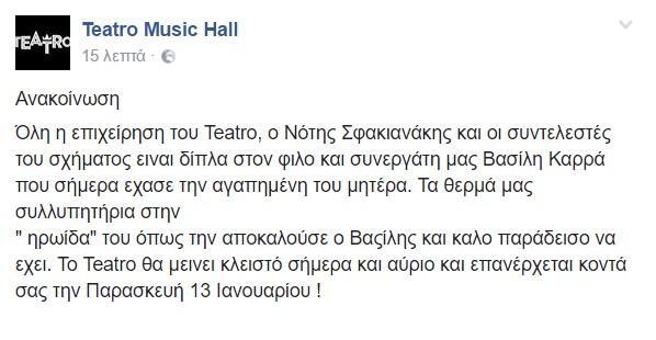 Η κηδεία της θα γίνει το Σάββατο στο Κοκκινοχώρι στην Καβάλα. Ο θάνατός της έχει «βυθίσει» στο πένθος τον τραγουδιστή και την οικογένεια του. Μάλιστα το νυχτερινό κέντρο όπου εμφανίζεται φέτος ο Βασίλης Καρράς, «Teatro», εξέδωσε ανακοίνωση ότι θα παραμείνει σήμερα και αύριο κλειστό.