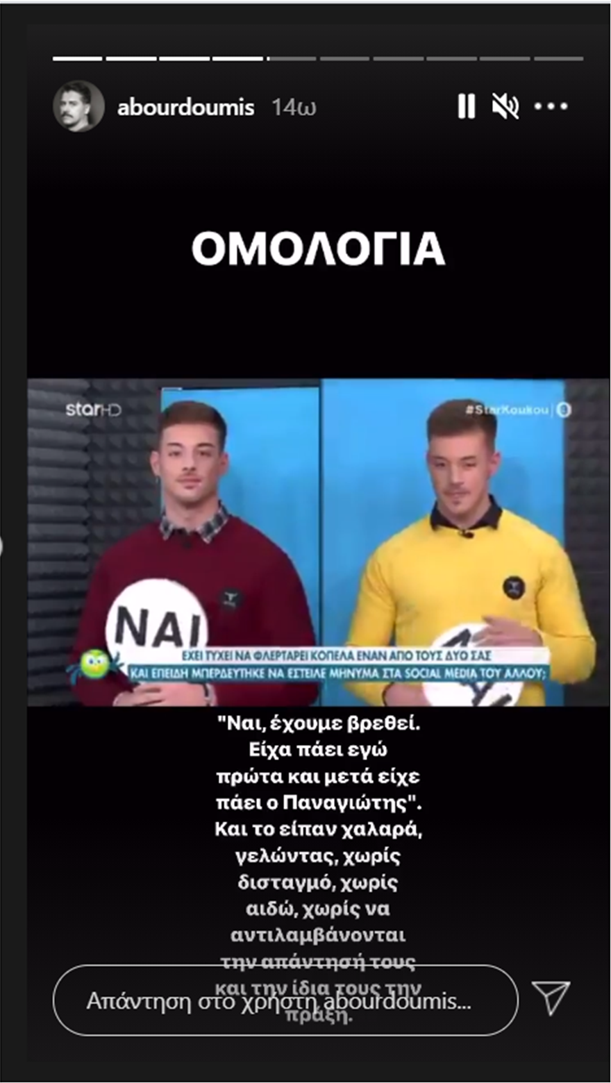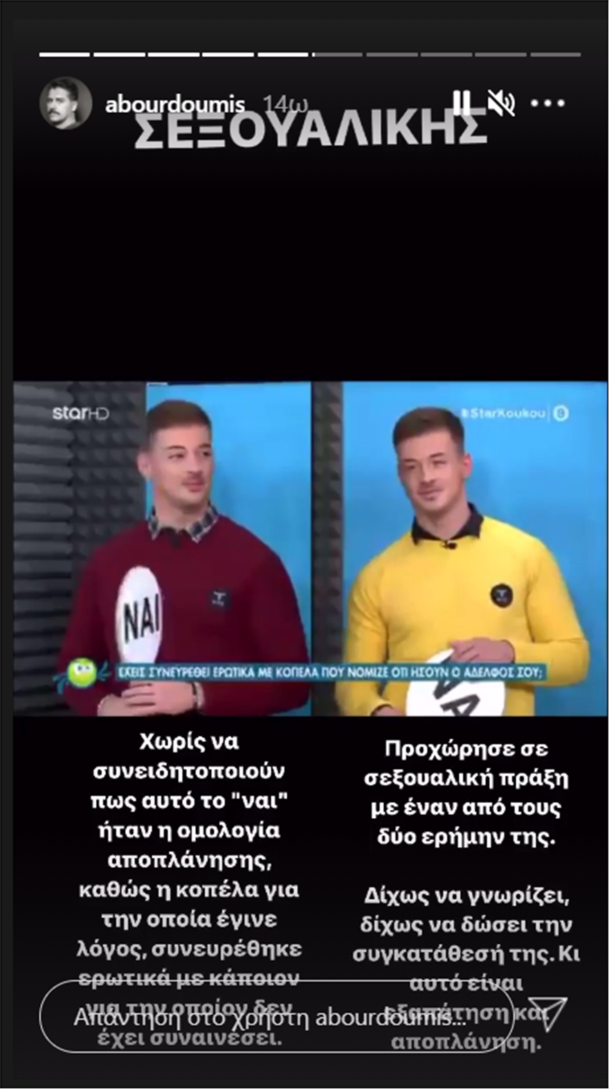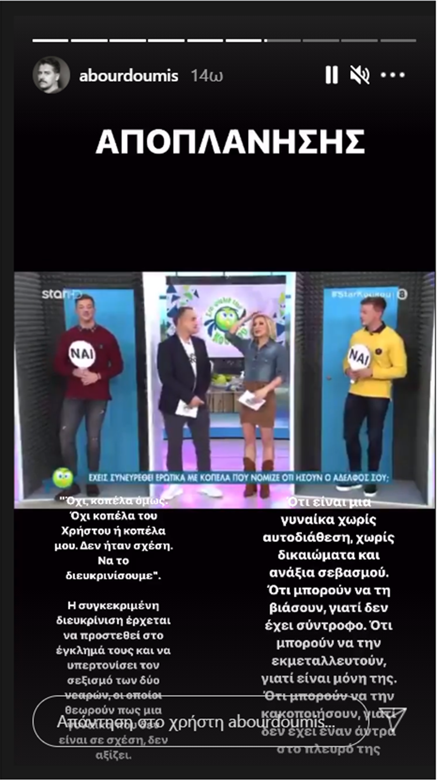 Ο ίδιος λοιπόν αναφέρει μέσα από InstaStories: «Ναι έχουμε βρεθεί. Είχα πάει εγώ πρώτα και μετά ο Παναγιώτης”. Και το είπαν χαλαρά γελώντας, χωρίς δισταγμό, χωρίς αιδώ, χωρίς να αντιλαμβάνονται την απάντησή τους και την ίδια τους την πράξη. Χωρίς να συνειδητοποιούν πως αυτό το “ναι” ήταν ομολογία αποπλάνησης, καθώς η κοπέλα για την οποία έγινε λόγος συνευρέθηκε ερωτικά με κάποιον για τον οποίον δεν έχει συναινέσει. Προχώρησε σε σεξουαλική πράξη με έναν από τους δύο ερήμην της. Δίχως να γνωρίζει, δίχως να δώσει την συγκατάθεσή της και αυτό είναι εξαπάτηση και αποπλάνηση.