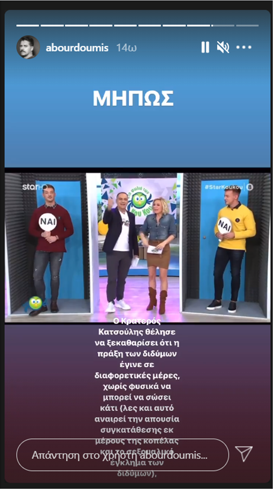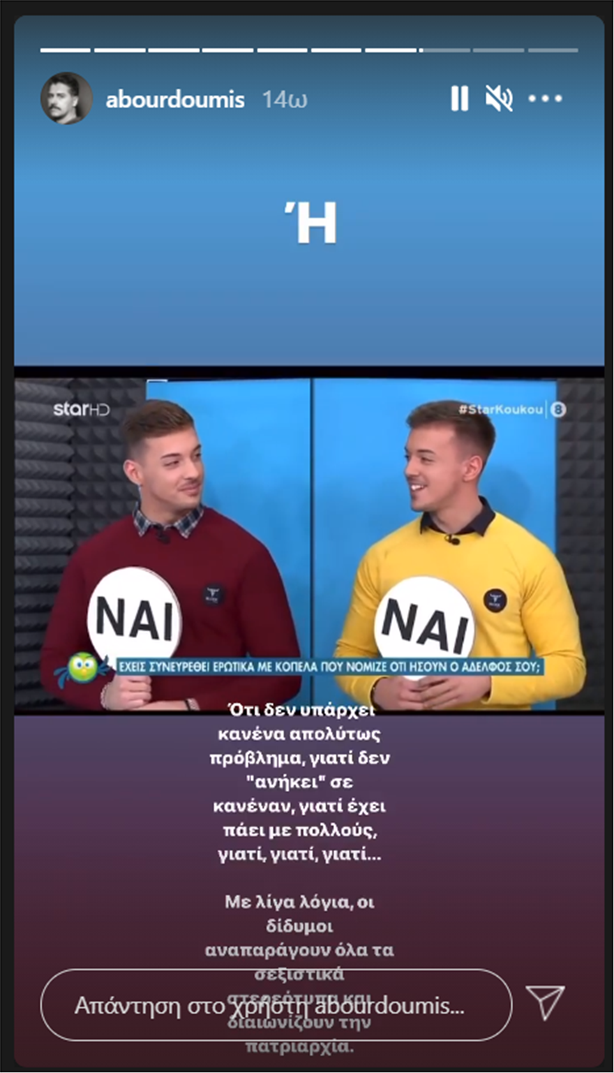 Ο ηθοποιός Αλέξανδρος Μπουρδούμης μετά την τηλεοπτική εκπομπή και την παραδοχή των διδύμων για τη διαδοχική τους συνεύρεση με κοπέλα, σχολίασε σε έντονο ύφος μέσα από τον προσωπικό του λογαριασμό στο Instagram ο Αλέξανδρος Μπουρδούμης.