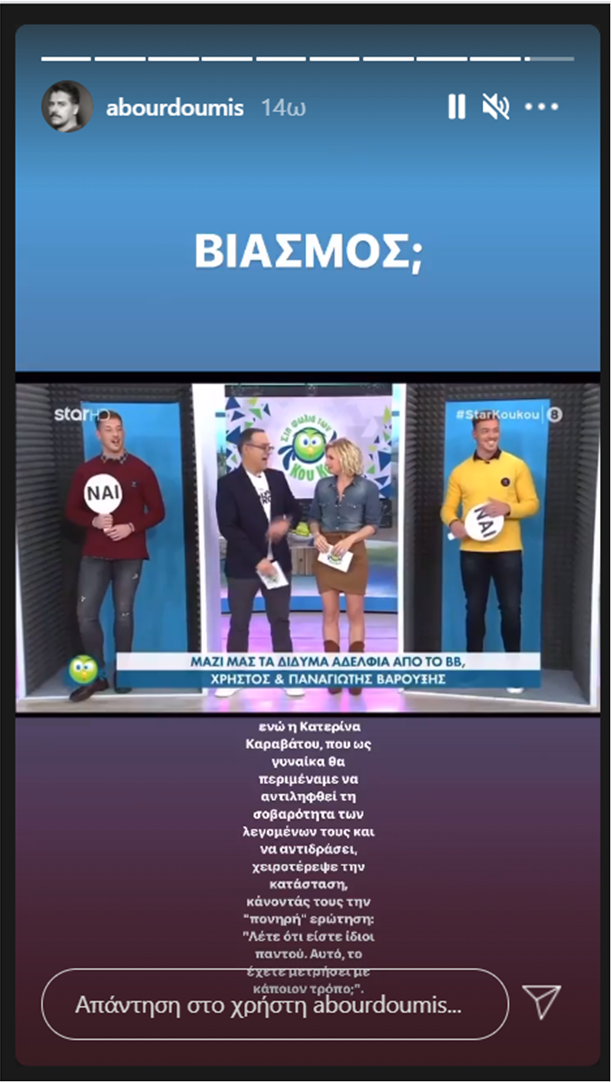 «Kακώς κάθομαι και μπαίνω στη διαδικασία να γράψω και να εξηγήσω αλλά επειδή βλέπω ότι κάποιους δεν τους αρέσει και τόσο που είπαμε ότι υπάρχει περίπτωση να μπούμε Survivor, για να χαλάσουν την εικόνα μας θυμήθηκαν να ξεθάψουν από την εκπομπή που ήμασταν 1 εβδομάδα πριν και πάνε να γράψουν ότι είμαστε και “Βιαστές”. Όταν σε μια σχέση 3 ατόμων (εγώ ο αδερφός μου και μια κοπέλα) η οποία έχει εκφράσει το ενδιαφέρον της να κάνει κάτι και με τους δυο και όπως ανέφερα στην εκπομπή δεν μας είπε κάτι αλλά θεωρώ ότι μας κατάλαβε και ήταν κάτι που σε εισαγωγικά το ήθελε. Αυτό θεωρείτε βιασμός; Mην προσπαθείτε να βγάλετε από τη μύγα ξύγκι».