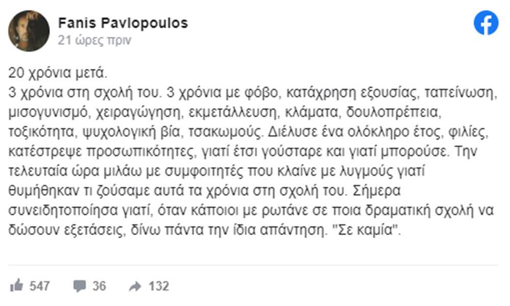 «3 χρόνια στη σχολή του. 3 χρόνια με φόβο, κατάχρηση εξουσίας, ταπείνωση, μισογυνισμό, χειραγώγηση, εκμετάλλευση, κλάματα, δουλοπρέπεια, τοξικότητα, ψυχολογική βία, τσακωμούς» έγραψε από την πλευρά του ηθοποιός, Φάνης Παυλόπουλος.