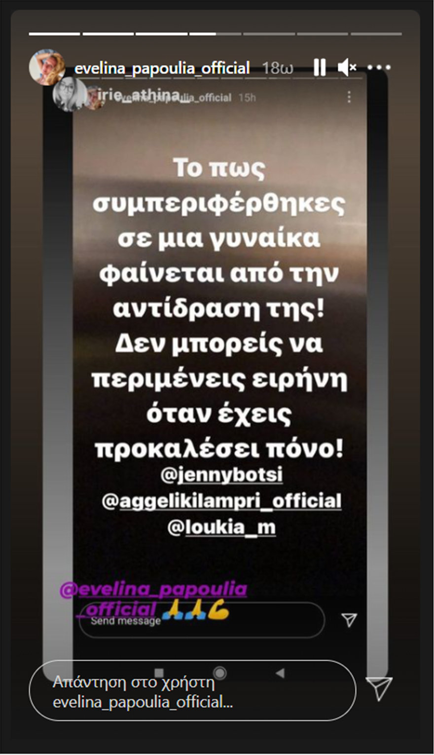 «Το πως συμπεριφέρθηκες σε μια γυναίκα φαίνεται από την αντίδρασή της. Δε μπορείς να περιμένεις ειρήνη όταν έχεις προκαλέσει πόνο», γράφει η κυρία Παπούλια στο story της στο οποίο μάλιστα έχει κάνει tag τα ονόματα των τριών κοριτσιών.