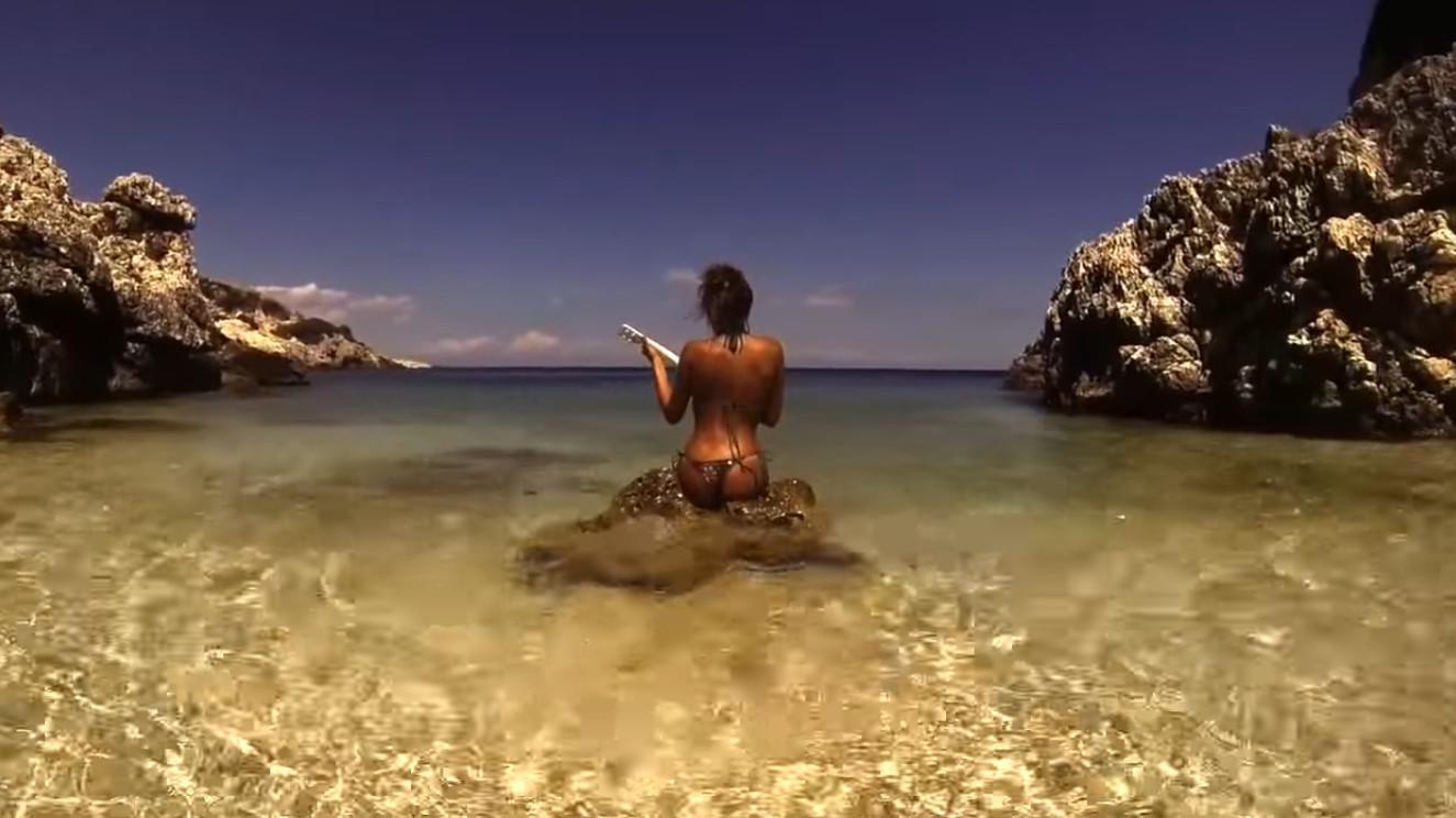 Η Κλέλια Ρένεση μοιάζει να απολαμβάνει την επαφή της με το νερό, ενώ στα πλάνα που βρίσκεται έξω από τη θάλασσα, κάθεται τοπλες, επάνω σε έναν βράχο και προσποιείται ότι παίζει με μία κιθάρα.