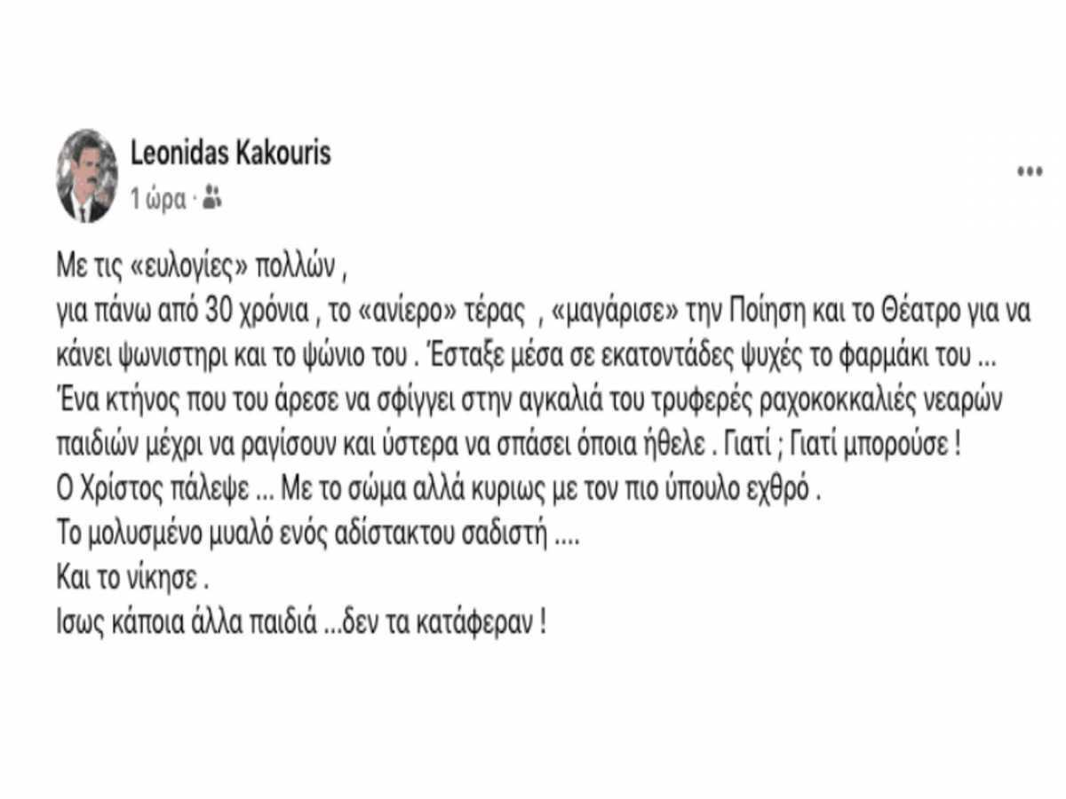 Με ανάρτησή του ο Λεωνίδας Κακούρης κάνει λόγο για ένα τέρας που έσταξε μέσα σε εκατοντάδες ψυχές το φαρμάκι του…