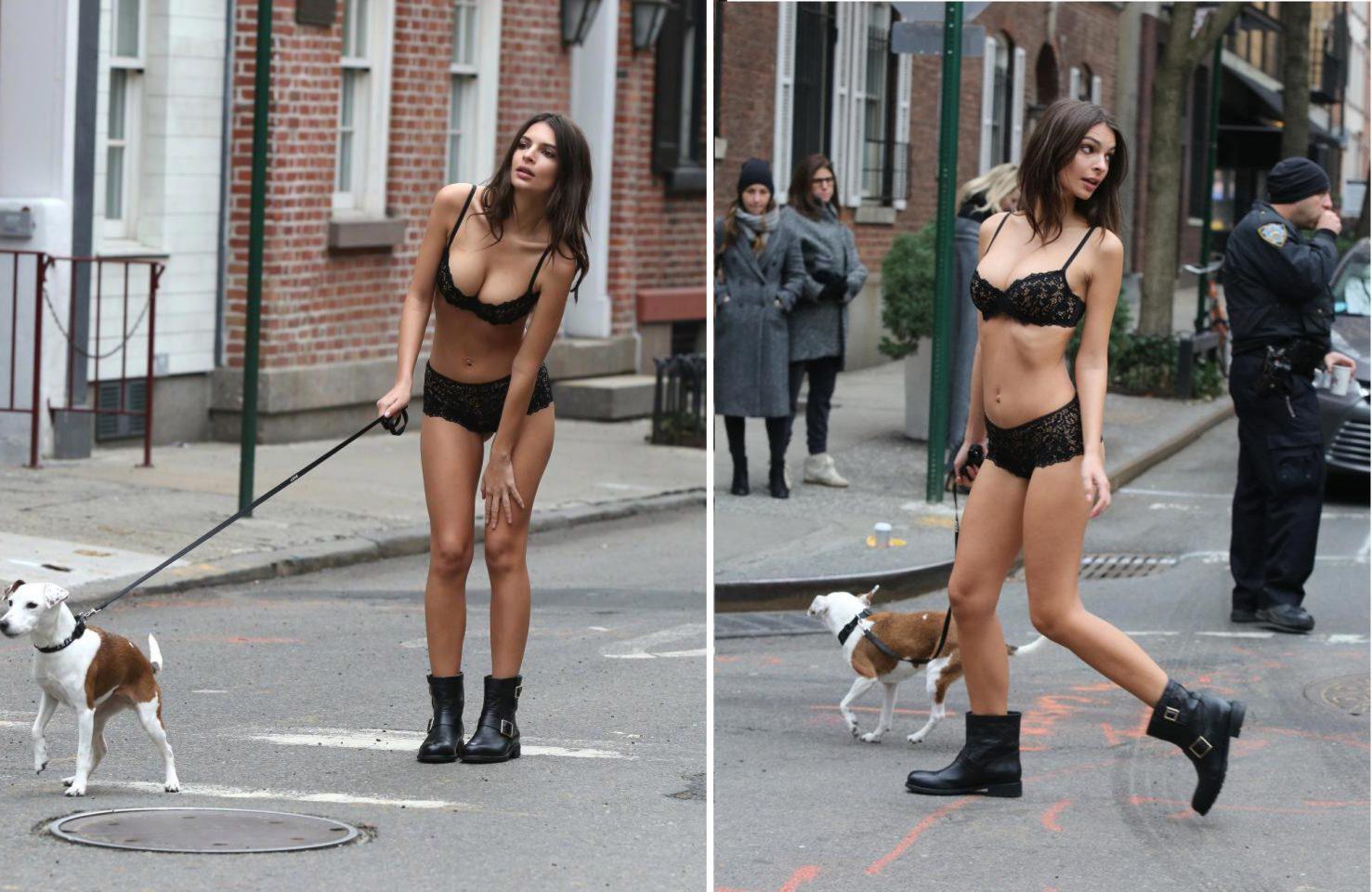 Για να προφυλαχτεί από το κρύο της αμερικανικής μεγαλούπολης, η Emily, το κορίτσι-θαύμα του μόντελινγκ, φόρεσε μόνο ένα ζευγάρι μαύρα μποτάκια.
