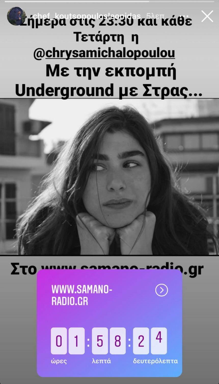 Όπως έγραψε ο Λεωνίδας Κουτσόπουλος, η Χρύσα Μιχαλοπούλου κάθε Τετάρτη βράδυ θα κάνει την ραδιοφωνική εκπομπή με τίτλο «Underground με Στρας». Ωστόσο ο σεφ το πρωί της Πέμπτης διέγραψε το στιγμιότυπο.