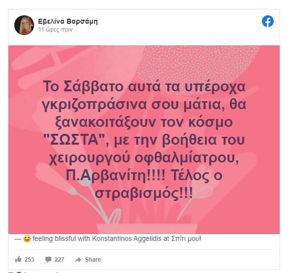 Το Σάββατο, όπως έγραψε η Εβελίνα Βαρσάμη ο Κωνσταντίνος Αγγελίδης θα κάνει άλλη μια επέμβαση, αυτή τη φορά στα μάτια: «Το Σάββατο αυτά τα υπέροχα γκριζοπράσινα σου μάτια, θα ξανακοιτάξουν τον κόσμο “ΣΩΣΤΑ”, με την βοήθεια του χειρουργού οφθαλμίατρου, Π.Αρβανίτη!!!! Τέλος ο στραβισμός!!!» έγραψε η σύζυγός του σε ανάρτησή της στο Facebook.