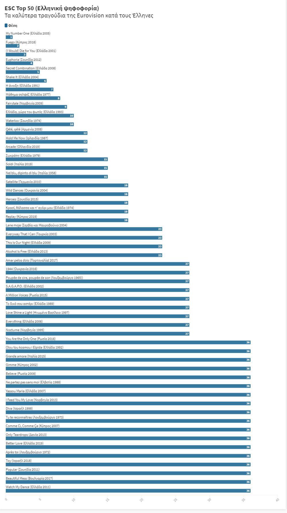 Όπως φαίνεται και στο διάγραμμα που ακολουθεί, οι Έλληνες λατρεύουμε τα τραγούδια της χώρας μας, καθώς στο ελληνικό top-50 βρίσκονται 18 τραγούδια που εκπροσώπησαν την Ελλάδα, με τα 7 από αυτά να είναι μάλιστα στην πρώτη δεκάδα. Ακολουθεί η Κύπρος, αλλά και η Σουηδία με 4 τραγούδια.