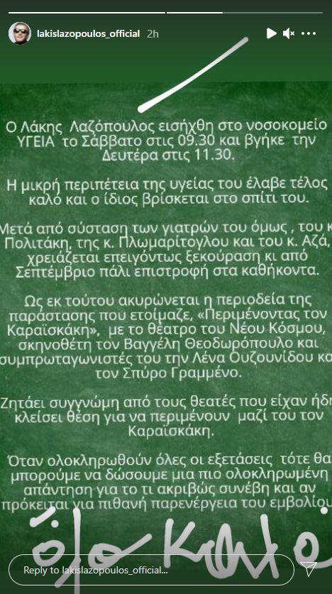 Μάλιστα, μετά από σύσταση των γιατρών του, ο Λάκης Λαζόπουλος θα χρειαστεί αρκετό διάστημα ξεκούρασης. Έτσι, ακυρώνει την περιοδεία της παράστασης που ετοίμαζε και θα επιστρέψει στις υποχρεώσεις του από τον Σεπτέμβρη.